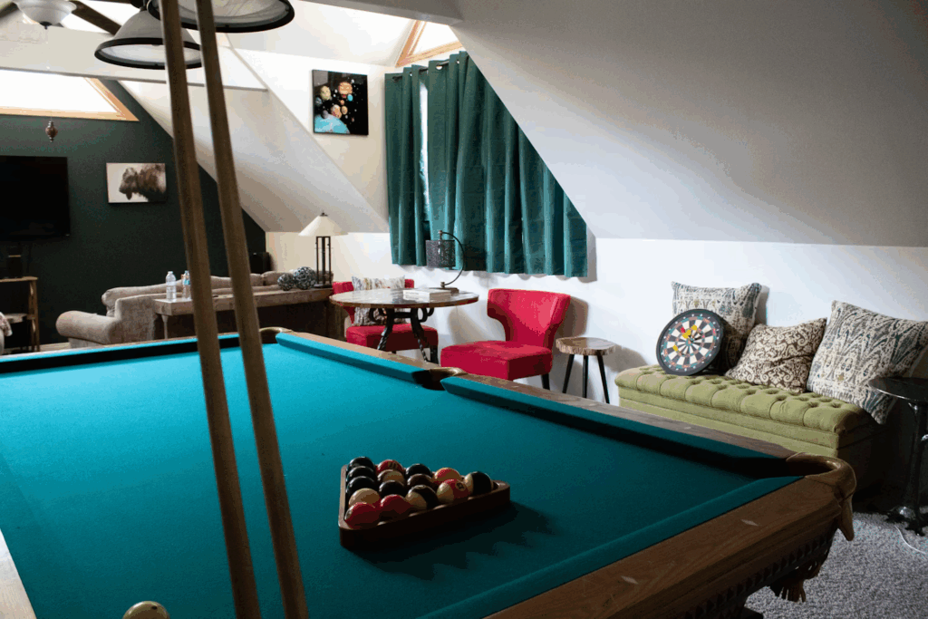 - A classic rec room with a pool table, dartboard, and cozy seating for a laid-back vibe